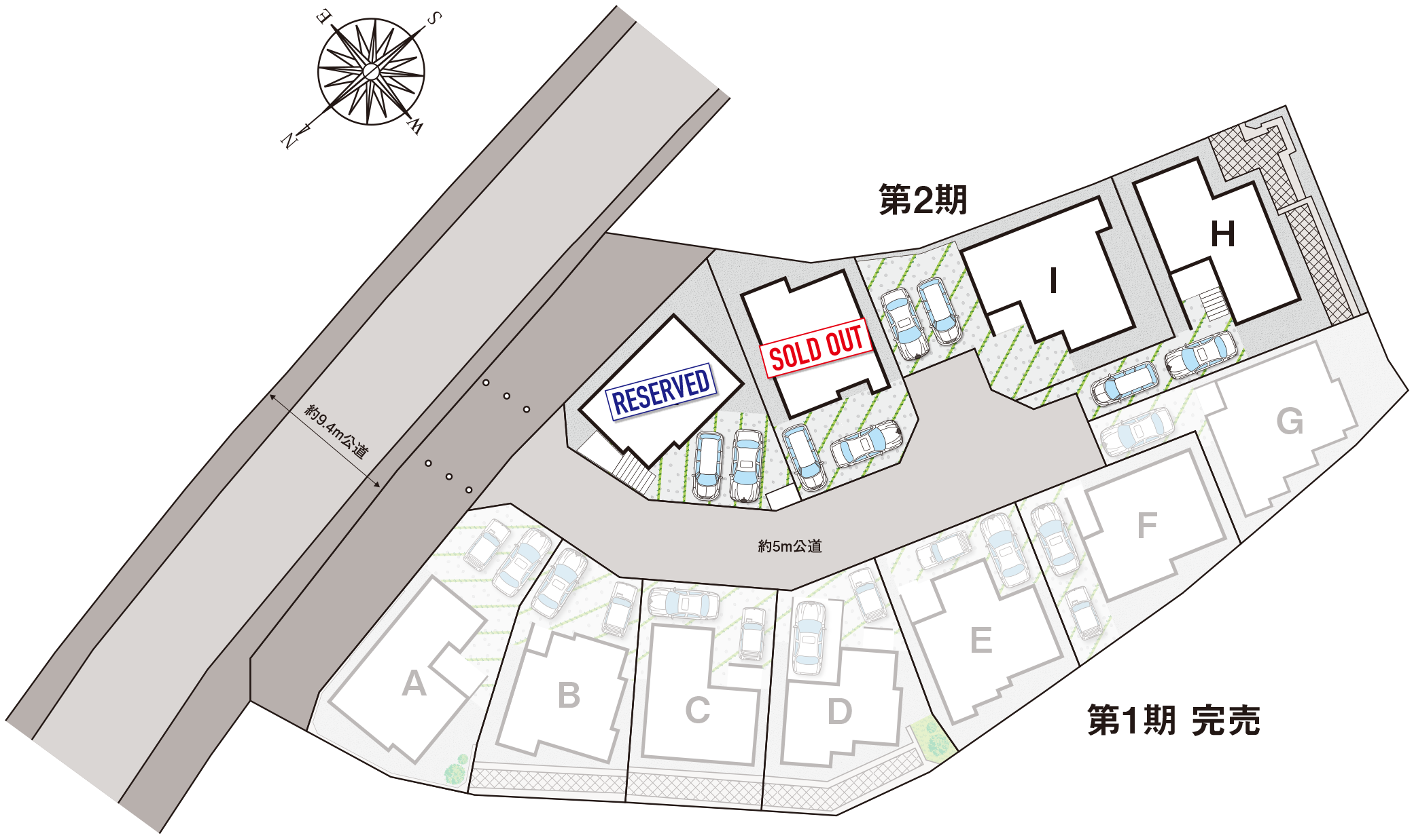 中央の開発道路を囲うように街並みを設計した現地は、おかげさまで多くのご契約をいただきながら街づくりが進み、第1期の7区画は完売となりました。