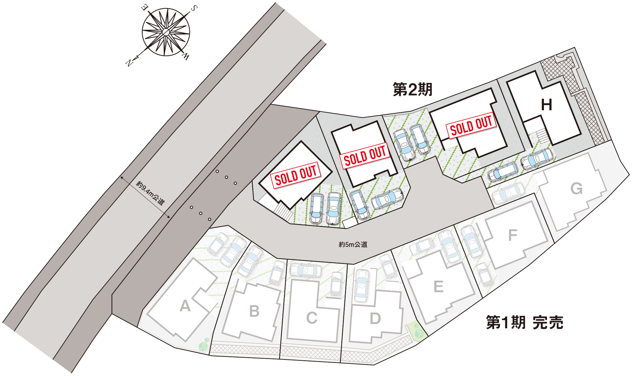 中央の開発道路を囲うように街並みを設計した現地は、おかげさまで多くのご契約をいただきながら街づくりが進み、第1期の7区画は完売となりました。