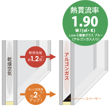 ガラスは高断熱・高遮熱のLow-E複層ガラスを採用し、さらに断熱性能を向上させるため内部にアルゴンガスを封入。
