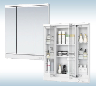 収納力のある3面鏡や2段のキャビネットも備えていますし、