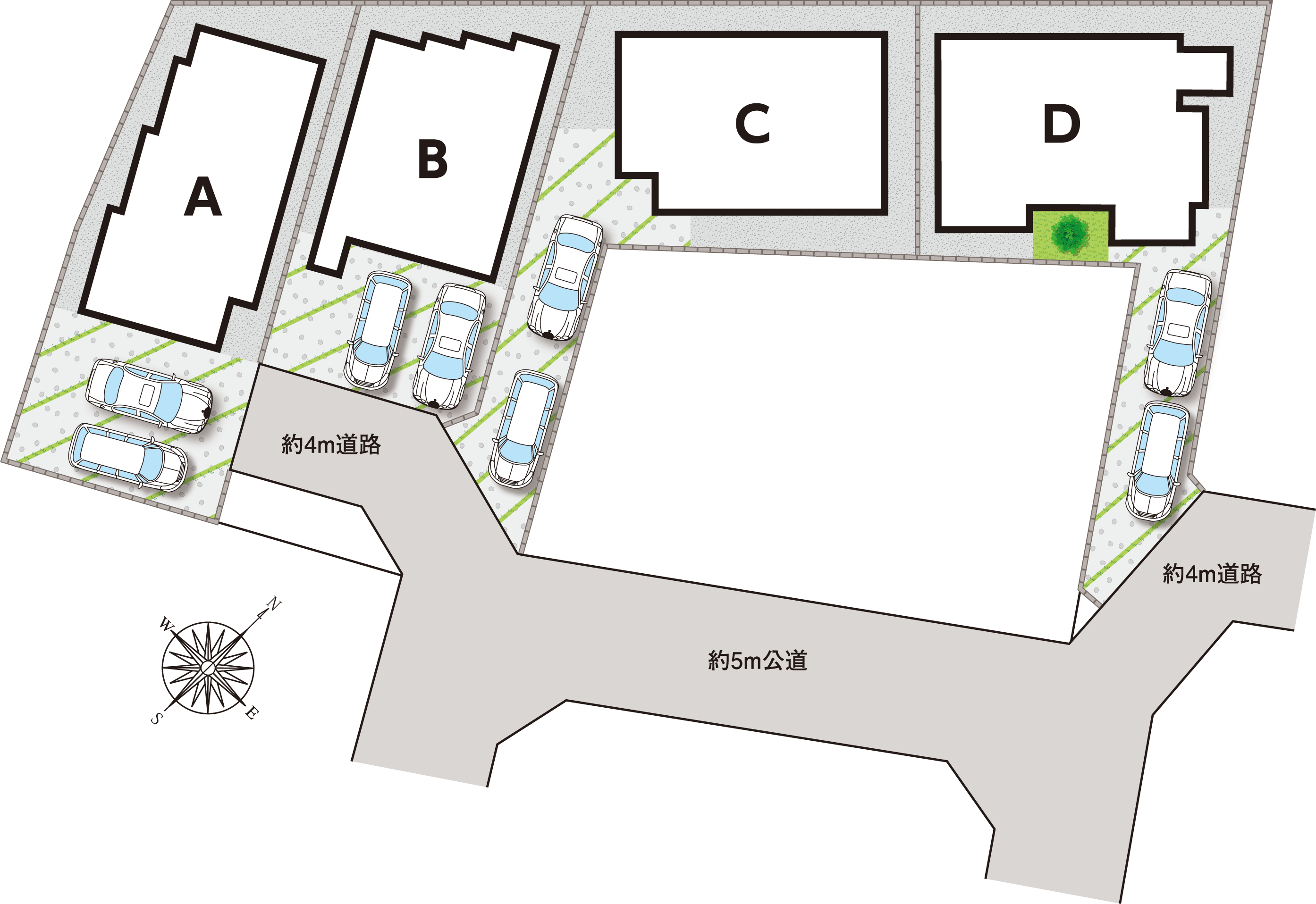 駅周辺から少し離れ、大通りからも中に入った静かな住宅地内の一角に設計された、全4区画の新規造成街区です。 4区画とも、約5m幅の公道から分かれる形で新規分譲地用に造られた位置指定道路にそれぞれ接道しています。 奥まった住宅地で周辺に暮らす人だけが道路を利用する場所であるため、車の通りも少なく安全ですし、駐車が得意ではない方でも車通りを気にせず安心して運転いただけます。 一番小さな区画でも敷地面積は36坪以上ありますから、どの区画も2台分の駐車スペースをしっかり確保できます。