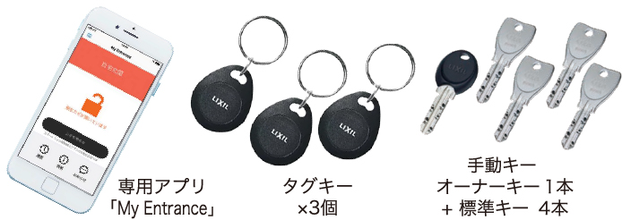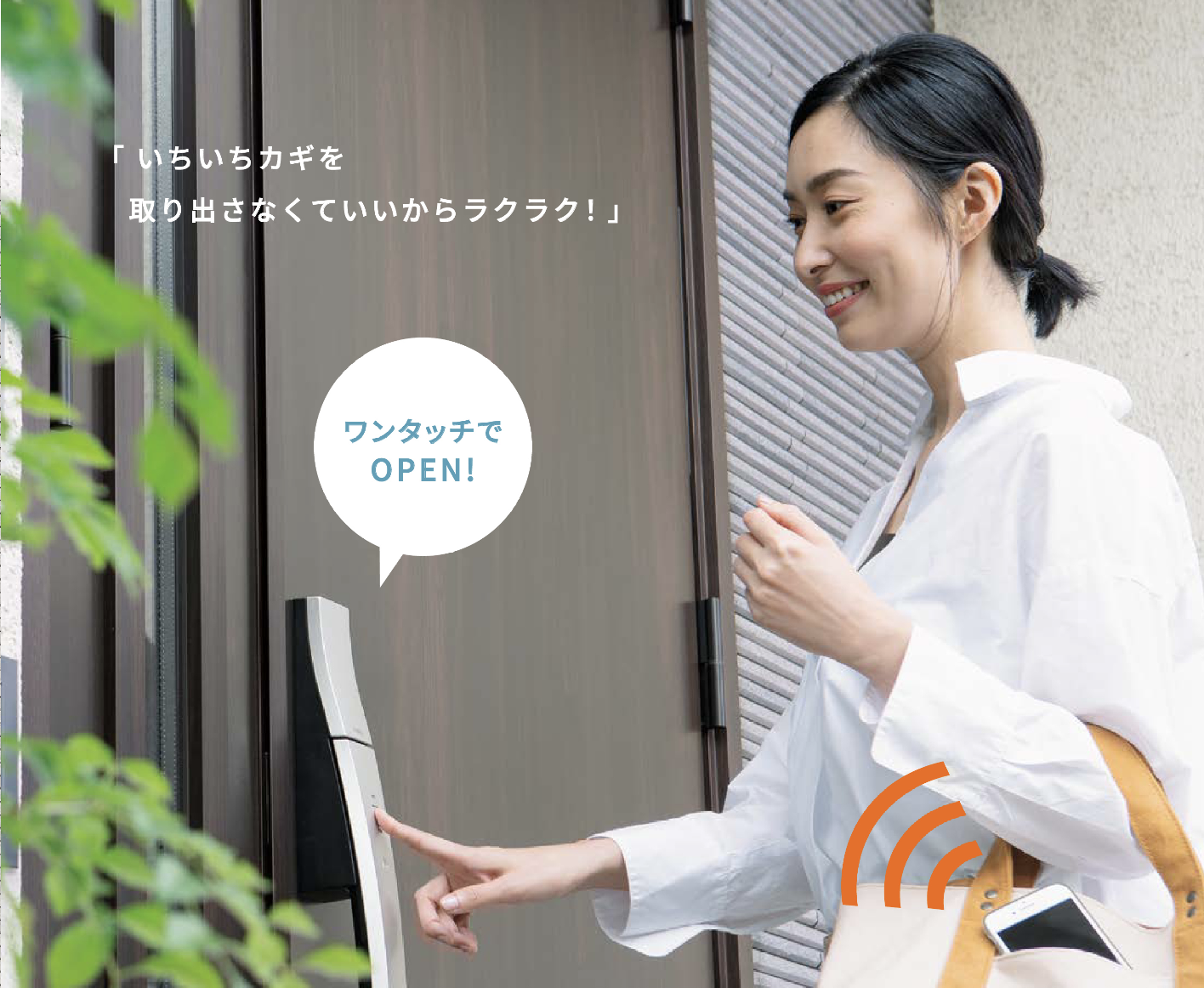 タグキーはもちろん、専用アプリをダウンロードでスマホが玄関キー代わりに。Bluetooth通信により、ボタンを押すだけで解施錠できます。