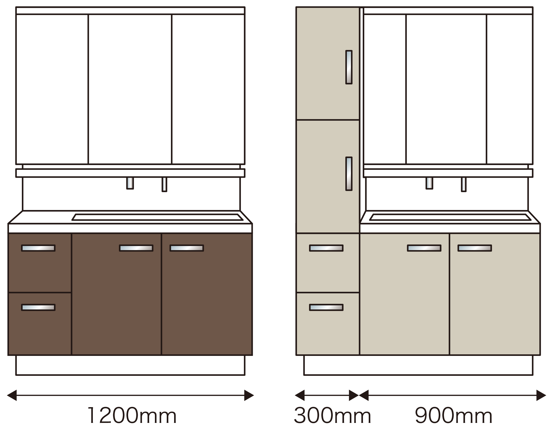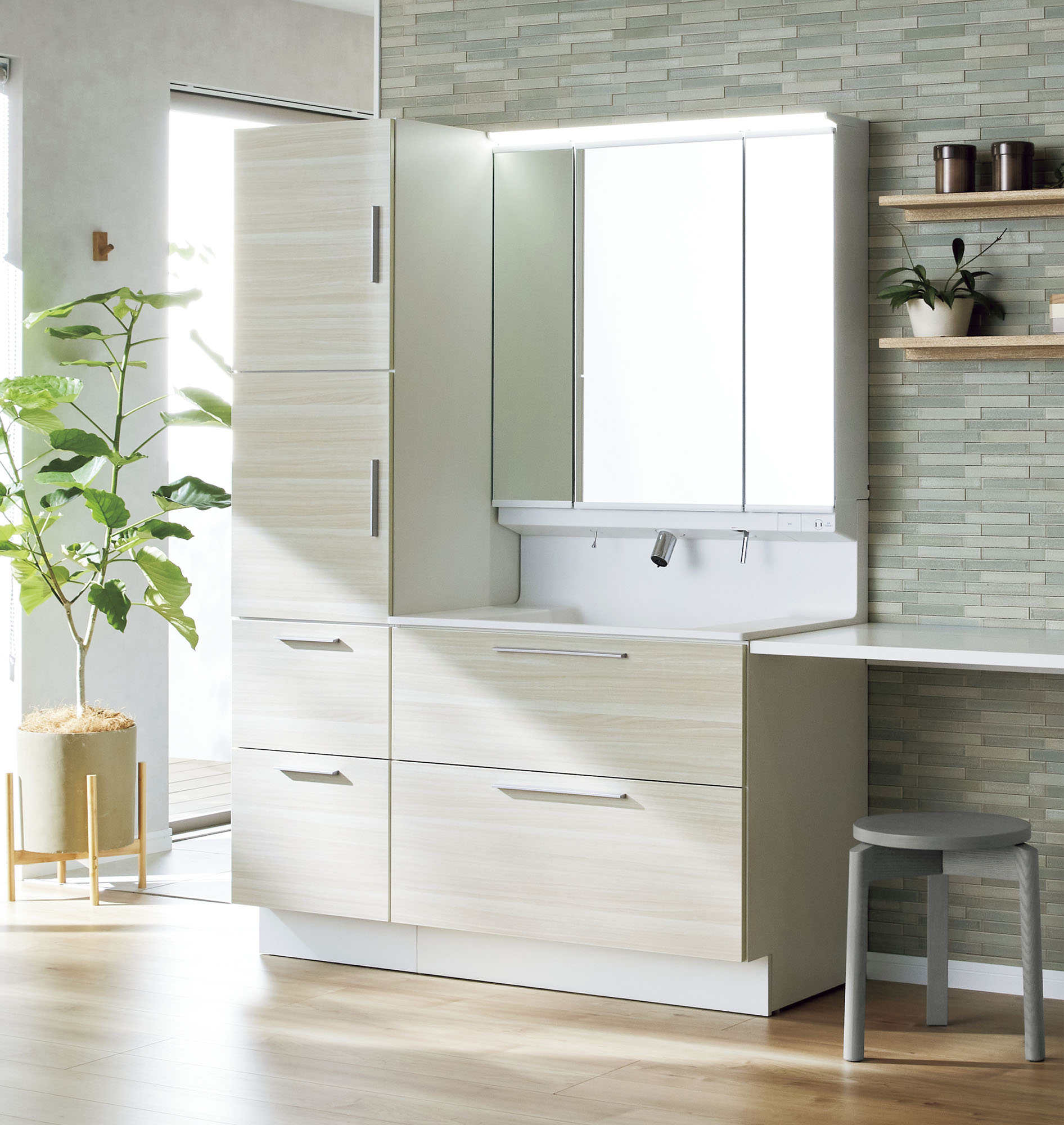 鏡やカウンターを広く使えるタイプ、サイドにキャビネットが付いた収納豊富なタイプのどちらでもお選びいただけます。