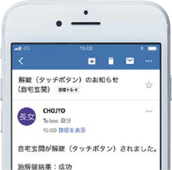 家族がスマートフォンで 施解錠した場合、 登録したメールアドレスに 通知を送る設定も可能です。