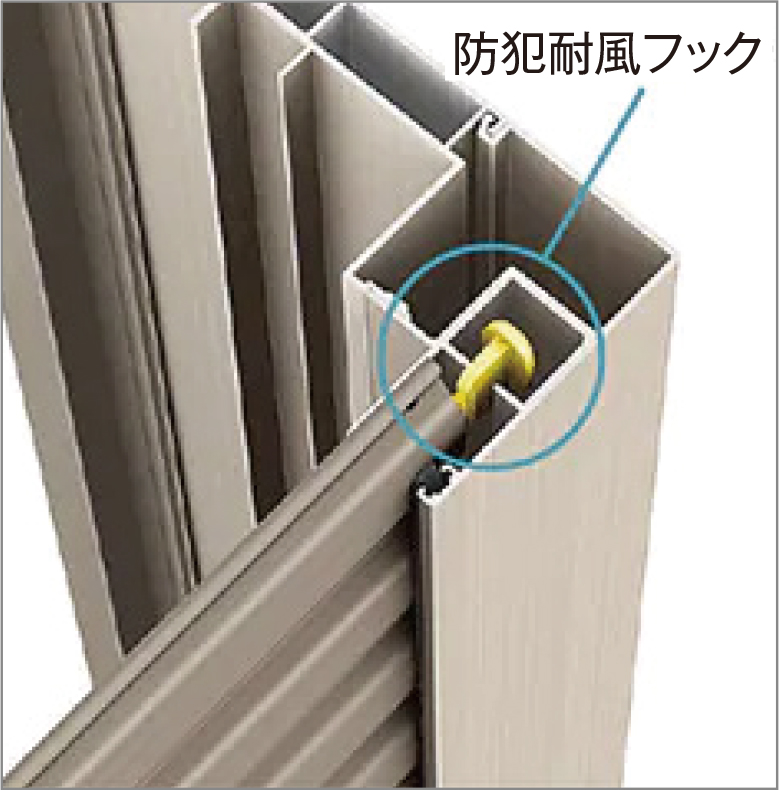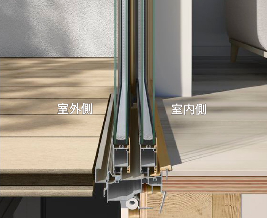 室外側に強度・耐久性に優れたアルミを採用し、雨、風、日差しによる劣化を防止します。